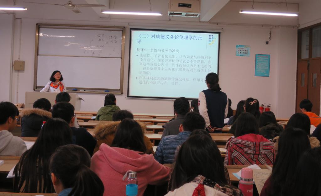 11月12日下午,四虎影院 本学期第一期院级公开教学观摩活动在6号楼314教室开展,本次公开课由曲蓉副教授主讲,主讲课程为《伦理学》,从“对康德义务论伦理学的批评”、“罗斯的显见义务论”、“对非结果论的批评”三个方面进行了详细的讲解和阐述。曲蓉老师的课程教学内容详实且有理论深度,案例丰富便于理解,通过知识点的回顾,增加与学生之间的互动。