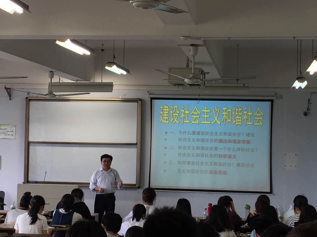 课上,王贤斌老师从“为什么要构建社会主义和谐社会”、“社会主义和谐社会是怎样的社会”、“如何构建社会主义和谐社会”三个方面进行了阐释,王老师讲课表述清晰,内容有理论深度,融合古今中外的史实深入浅出的阐述”和谐”社会的历史发展,在开阔学生视野的同时,也帮助学生掌握知识点,在讲解中穿插视频教学达到了良好的教学效果。