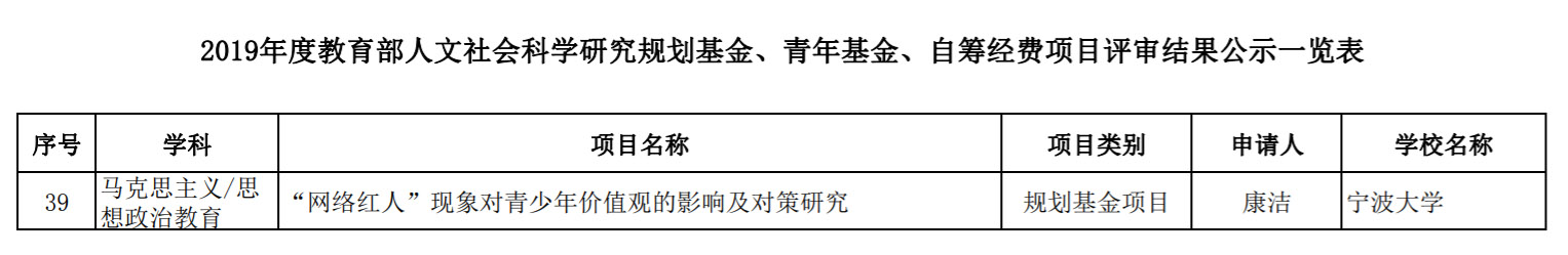 1月29日,教育部社科司对2019年度教育部人文社会科学研究一般项目评审结果进行公示。其中,规划基金、青年基金、自筹经费项目共3098项通过专家评审。四虎影院 康洁老师的项目《“网络红人”现象对青少年价值观的影响及对策研究》获规划基金项目立项公示。