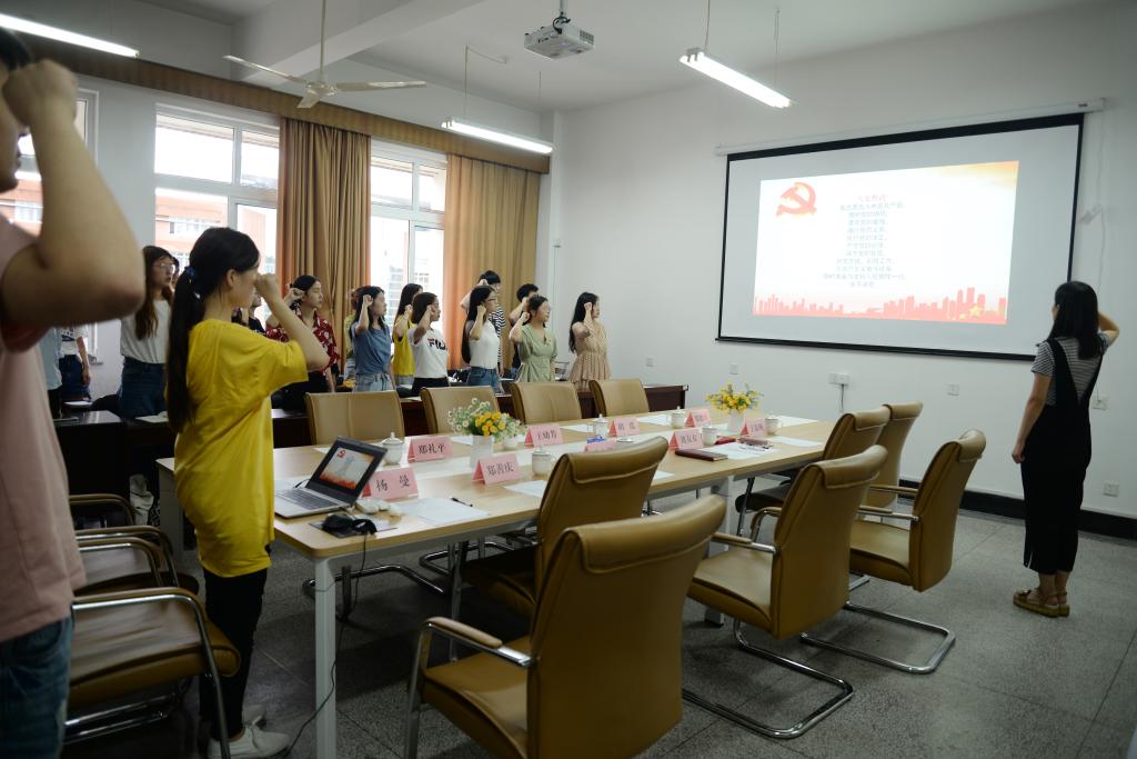 刘友女首先对学院2019上半年新发展的党员进行了集体谈话。她从守住入党初心,不断奋进前行这两个方面对新发展的党员们提出了期望与要求。她表示,一位共产党员的初心对于党员同志来讲具有至关重要的意义,要想清楚自己为什么入党,坚定自己的入党初心。同时作为一名党员在各方面都要起先锋模范作用,不断加强自身的建设,提高各方面的素质,在此基础上投身到为社会服务的实践当中去。随后,在杨曼同志的领誓下,本次新发展党员面对党旗党徽进行了入党宣誓。