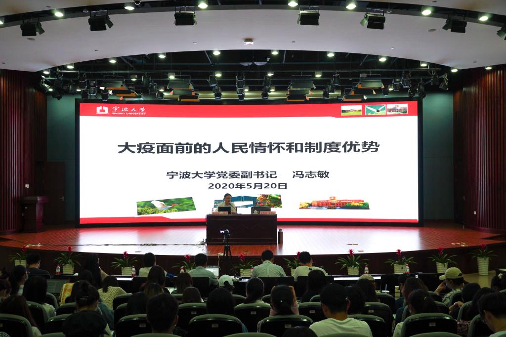 冯志敏副书记首先分析了当前全球疫情的严峻形势,并从坚持以生命与健康为本的人民情怀、彰显党的领导和社会主义制度优势、体现万众一心战胜疫情的中国力量等三个方面作了重点阐述。他用详实的数据、大量的图片、生动的案例对国内外抗疫的举措和成效进行了鲜明的对比,深刻剖析了党的集中统一领导的制度优势、集中力量办大事的社会主义制度优势、人民当家作主和现代治理的制度优势以及依靠科技进步和科学家力量的制度优势;深情赞扬了在抗击疫情中中国人民所展示出来的“大爱无疆、救死扶伤”的牺牲精神、“迎难而上,不怕牺牲”的英雄主义、“众志成城,守望相助”的集体主义、“国而忘家,公而忘私”的爱国主义、“团结一心,同舟共济”的合作精神等中国精神和中国文化;高度肯定了我校附属医院赴武汉医护团队、校友和全校师生所展示的精神风貌,为疫情防控和复学复课做出了宁大贡献。