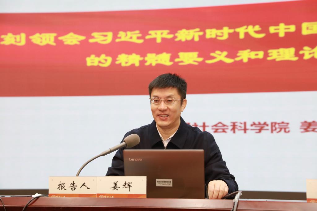 姜辉重点介绍了新中国七十多年奋斗历程和伟大成就、全面建设中国社会主义现代化国家的伟大实践、新时代中国特色社会主义的世界意义等内容。姜辉指出,习近平新时代中国特色社会主义思想是当代中国马克思主义、21世纪马克思主义,是指引实现中华民族伟大复兴的行动指南。深入学习贯彻习近平新时代中国特色社会主义思想,要学好用好《习近平谈治国理政》,领会精髓要义,紧密联系实际,把学习党的创新理论同学习马克思主义基本原理结合起来,同学习党史、新中国史、改革开放史、社会主义发展史结合起来,同把握和推进新时代伟大实践结合起来。