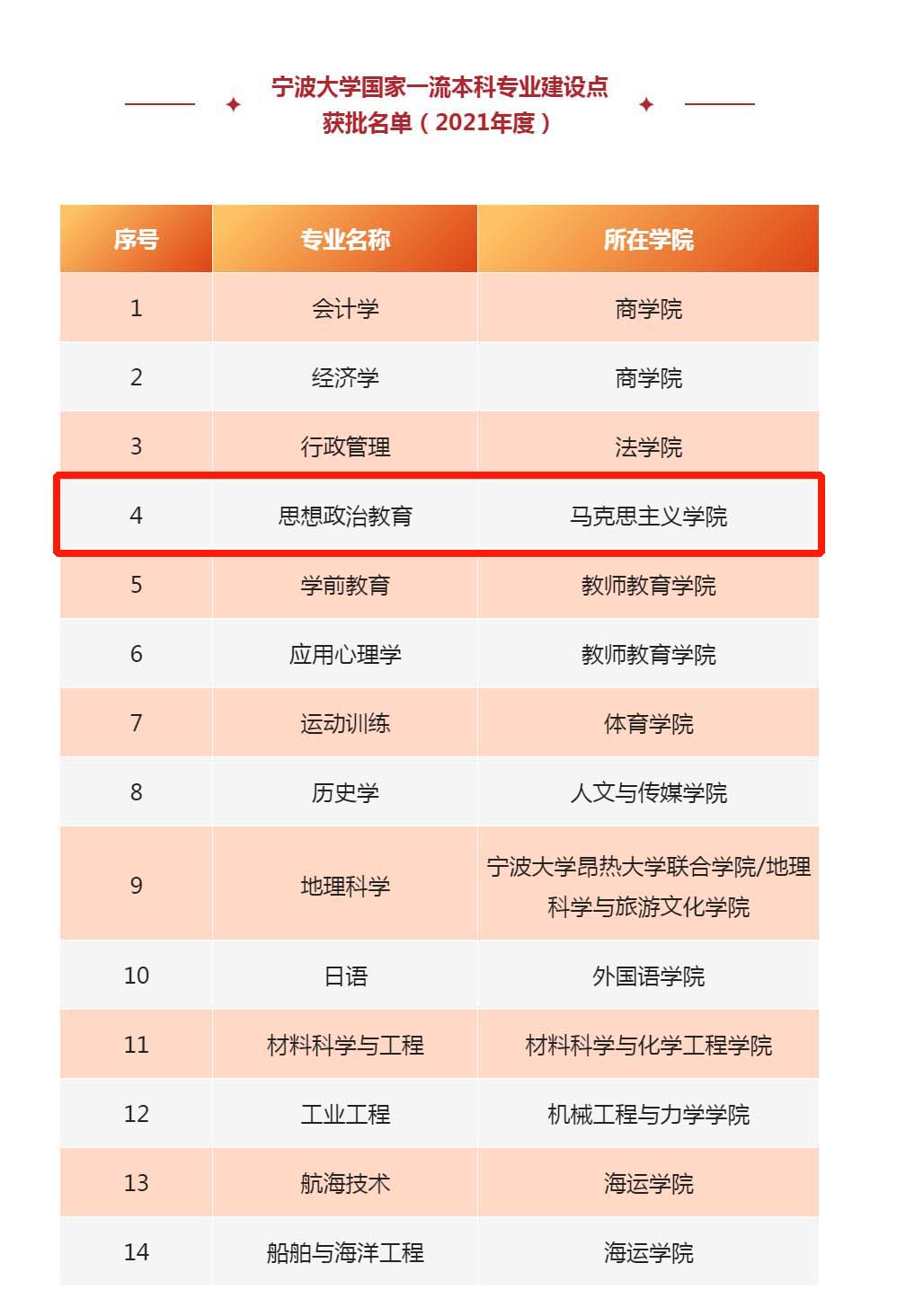 思想政治教育(师范)本科专业办学历史悠久,始建于1982年设立的原宁波师范学院政史专业,1988年设立思想政治教育本科专业。近年来,本专业在全国排名中稳步提升,2020年升级为四星级专业(邱均平团队评价体系);校友会连续五年(2016-2021)均为5星级专业。2021年入选省一流专业建设。