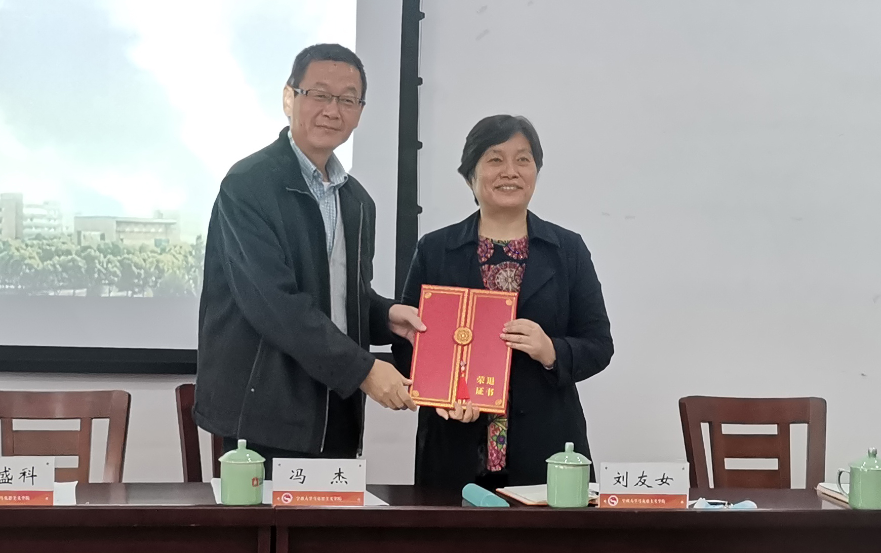 会上举行了退出干部荣退仪式。冯杰为刘友女颁发荣退证书,教职工代表献花。