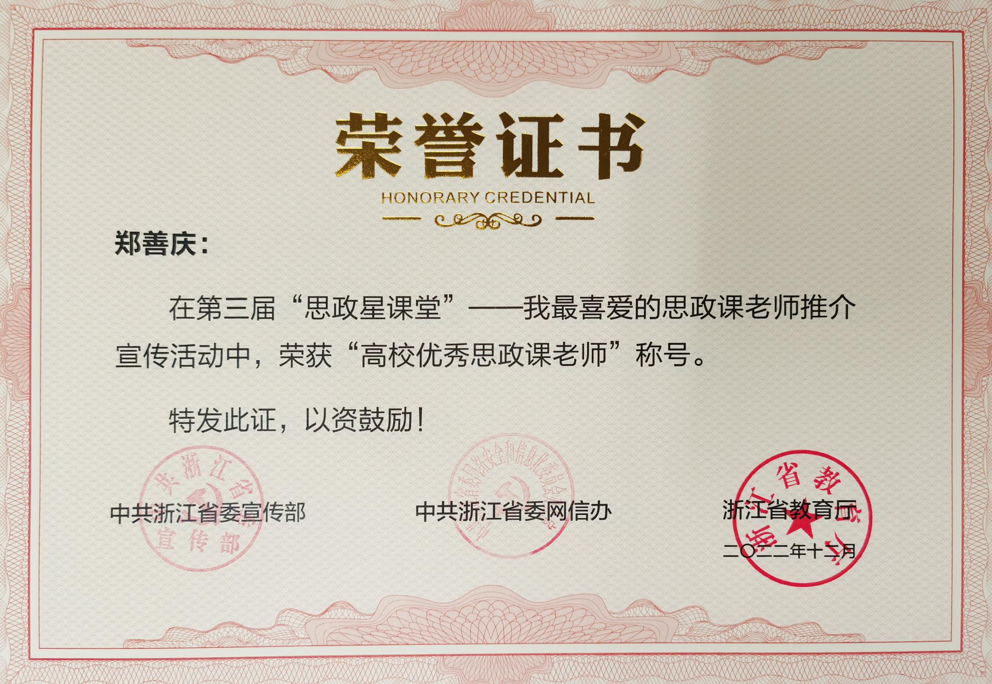 日前,由中共浙江省委宣传部、中共浙江省委网信办、浙江省教育厅主办的第三届“思政星课堂”——我最喜爱的思政课老师推介宣传活动公布了获奖名单。四虎影院 郑善庆副教授被评为“高校优秀思政课老师”。