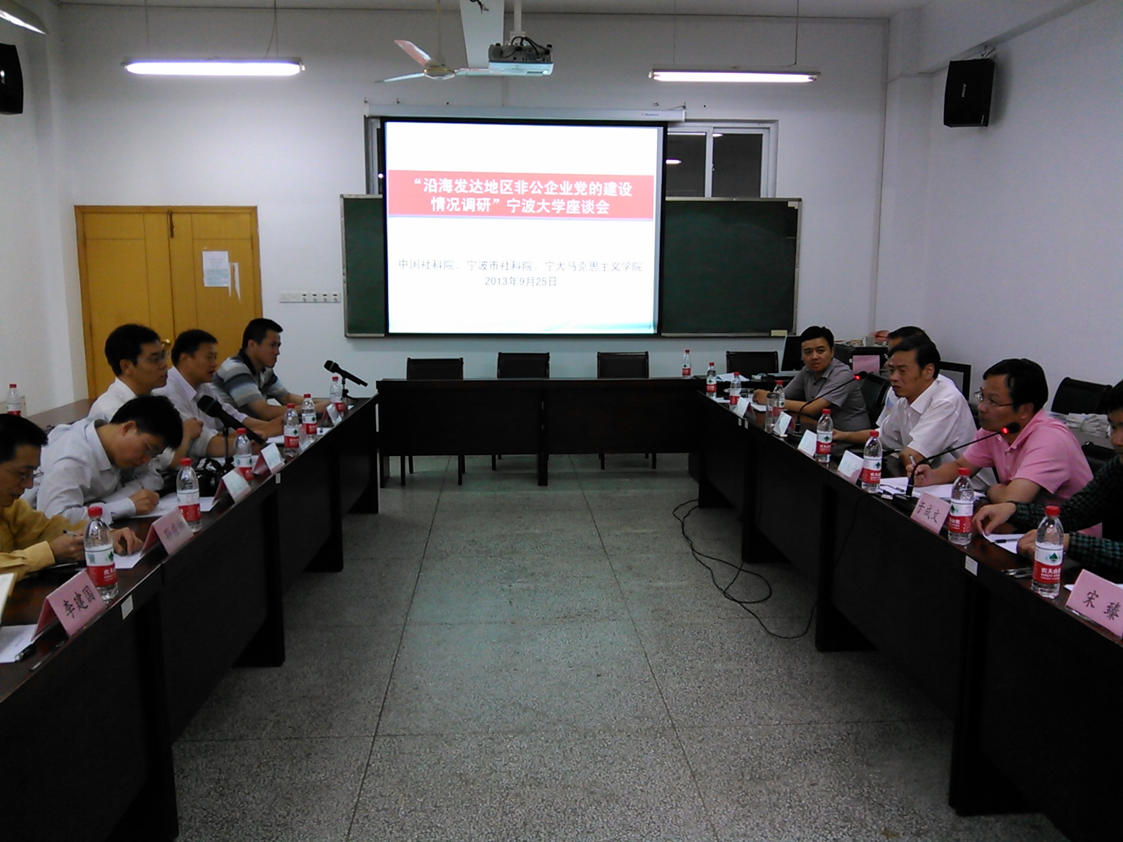 当前,非公经济在全国经济中的成分比例、就业人员都占了大部分,如何有效推进加强非公企业党的建设,发挥好非公企业党建对于巩固社会主义初级阶级基本经济制度,引导非公有制经济持续健康发展,加强党在非公经济领域领导作用力的发挥,这是新时期党的建设的一个重大现实课题。作为非公经济发达地区,近些年来,宁波市在非公企业党的建设上作了积极的探索实践,积累了一些经验,同时也面临许多实践中的共同问题需要研究解决。座谈会上,全国党建研究会特邀研究员陈正良教授就宁波市非公企业党建的基本情况、非公企业党建的类型、特点、主要问题及相关的对策思考作了交流发言,肖东波教授就非公企业党建的作用、目的等提出了自己的问题思考、郑礼平副研究员结合非公企业个案调查对当前非公企业党建中一些问题谈了自己的看法,我院于成文博士、司强博士、王贤斌博士等部分教师也参加座谈。