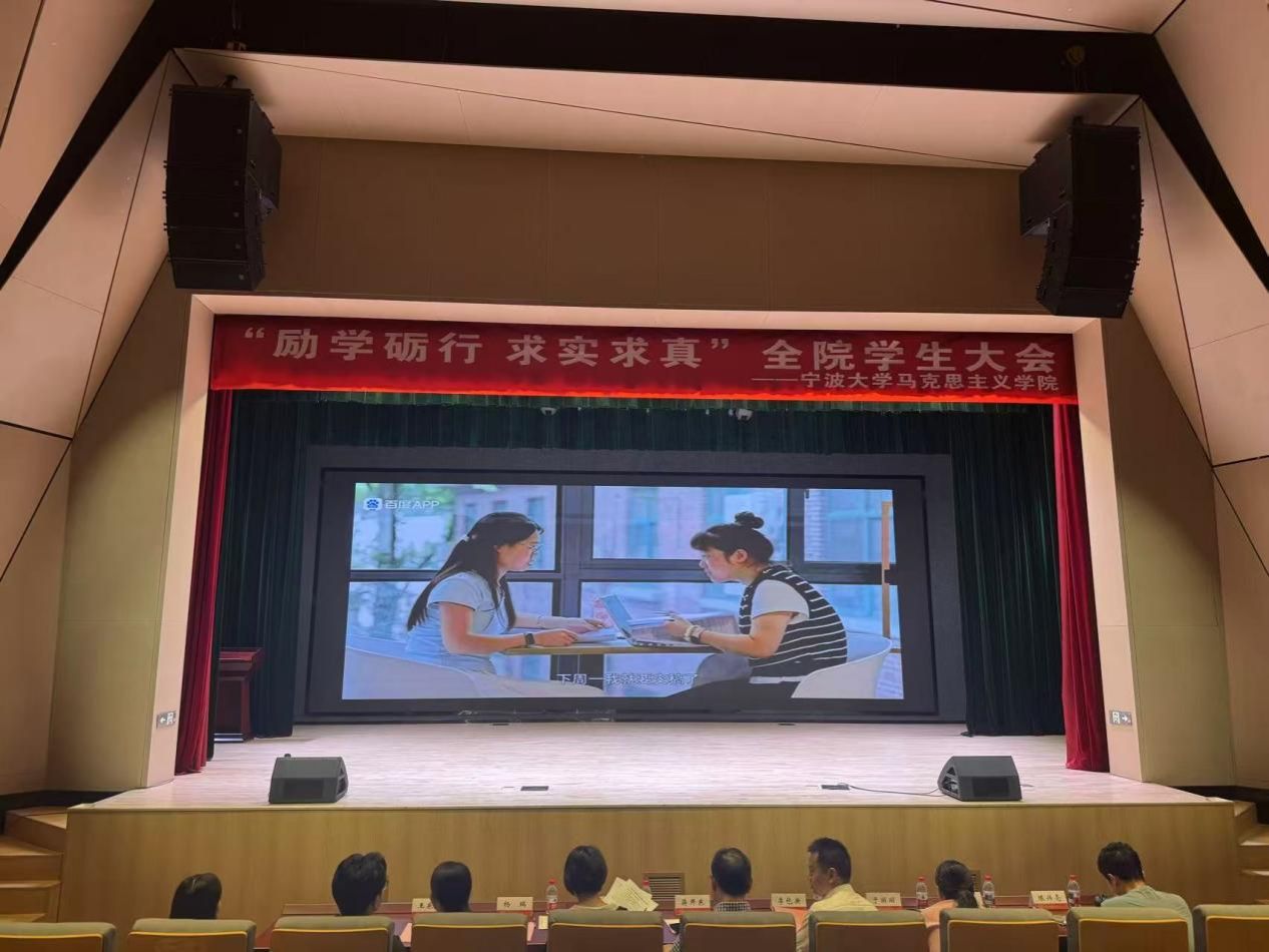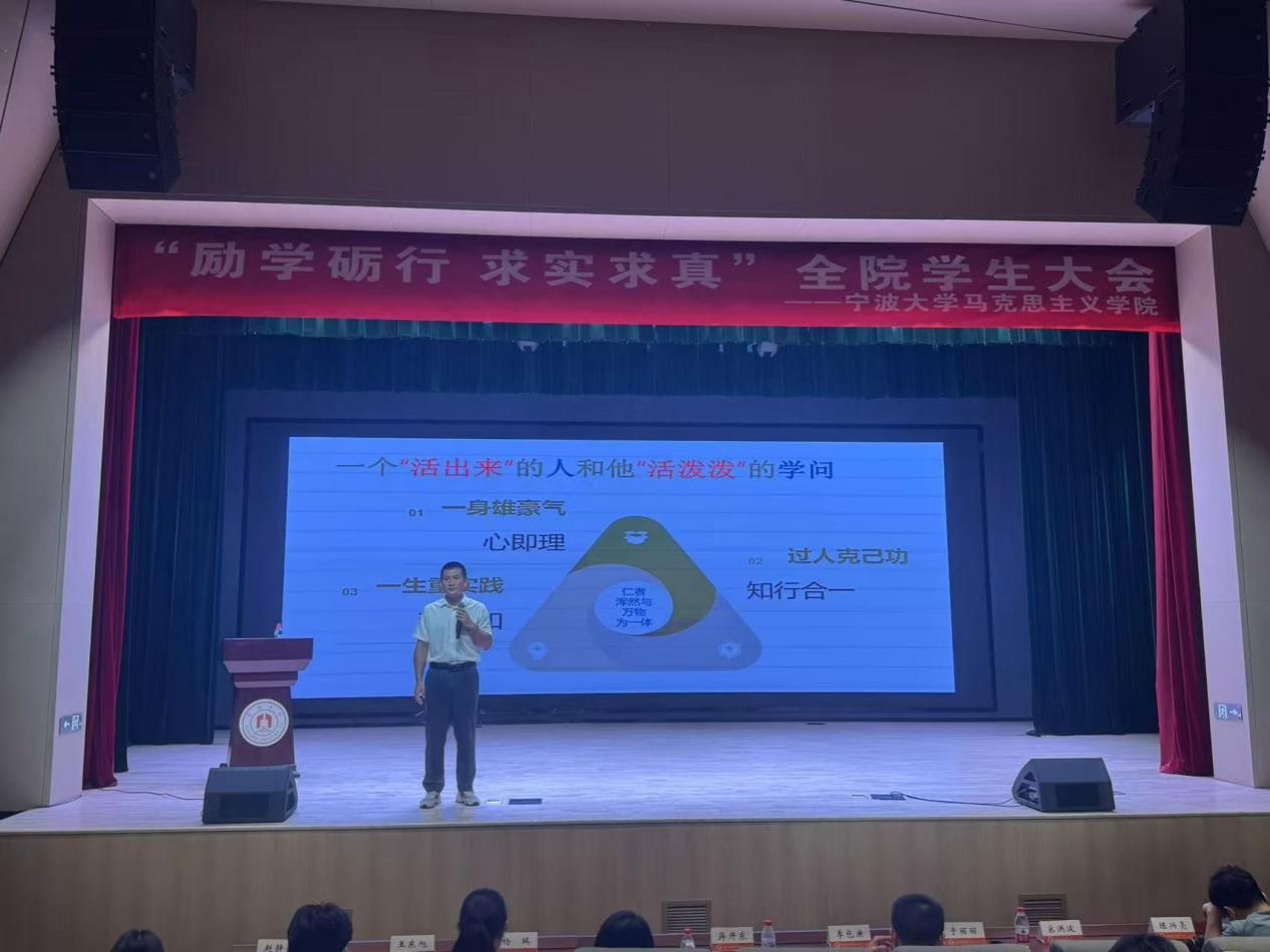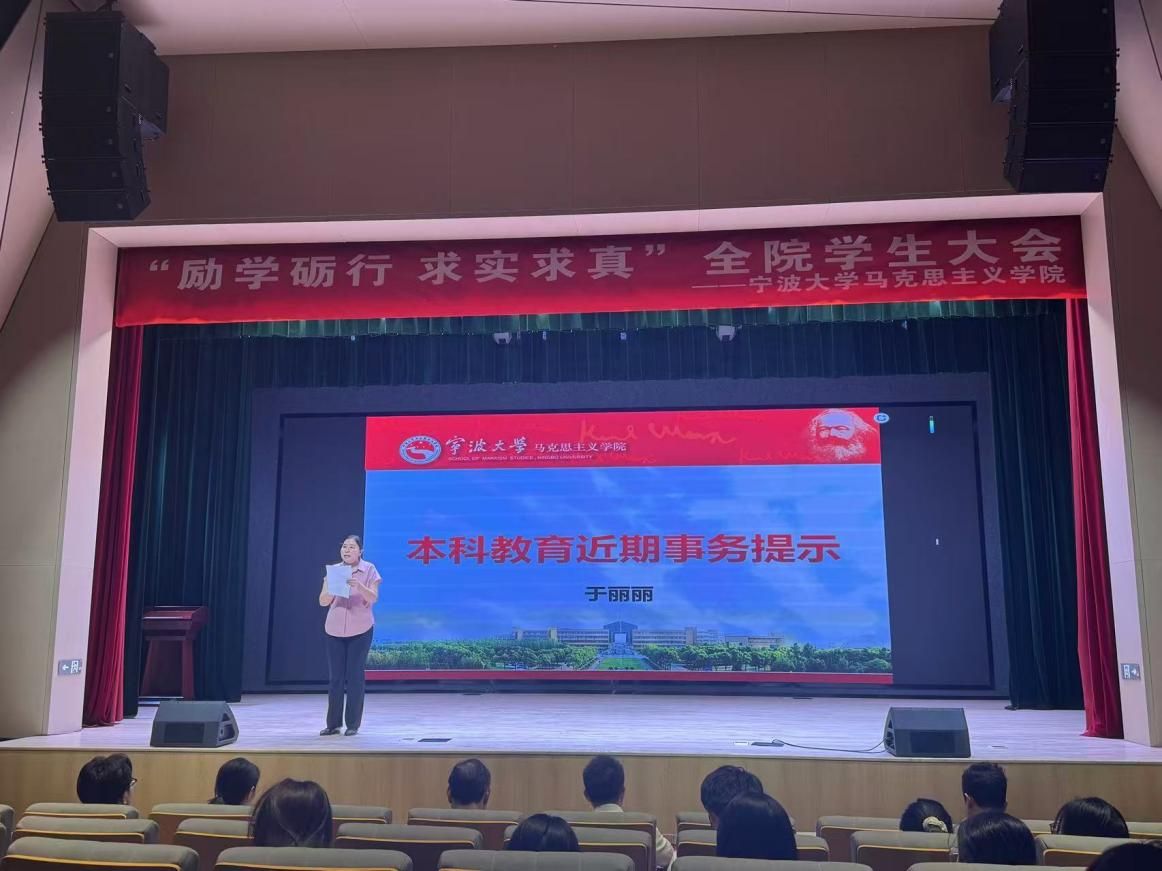2025年9月27日上午,宁波大学马克思主义学院在锦绣小剧场隆重举行以“励学砺行 求实求真”为主题的全院学生大会。参加本次会议的有院党委书记蒋开东,执行院长李包庚,党委副书记、纪委书记吴莲红;思政中心主任于丽丽;心理健康指导中心专职教师宋洪波;班主任陈兴亮、杨瑞、王东旭、赵静芳;辅导员杨曼、王子烜,以及全体本科生和研究生。吴莲红主持会议。