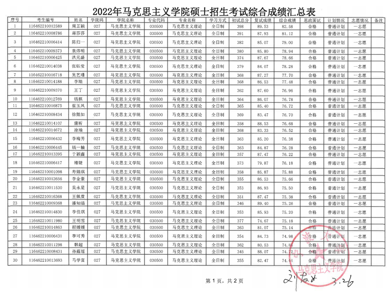 马克思主义学院2022年硕士研究生招生考试综合成绩公示(一)