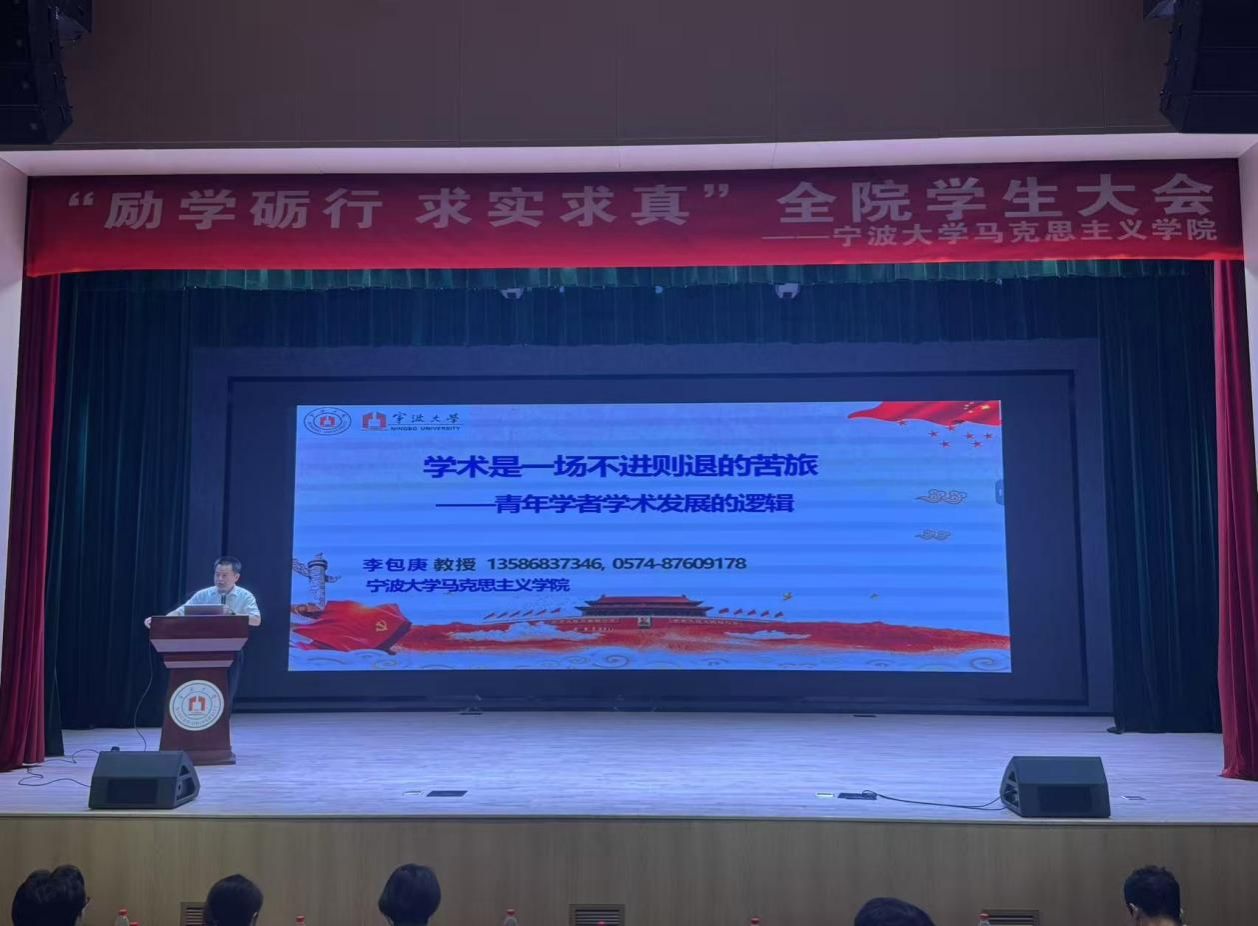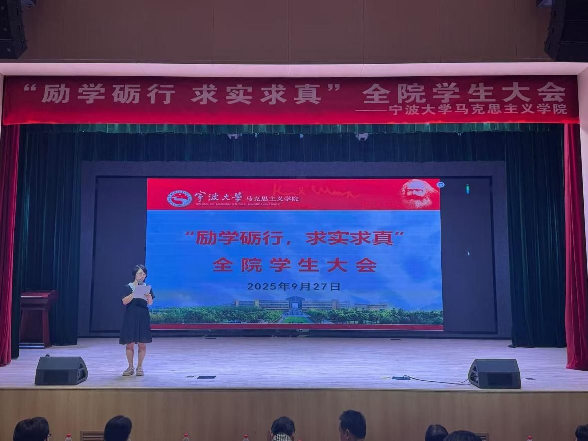 2025年9月27日上午,宁波大学马克思主义学院在锦绣小剧场隆重举行以“励学砺行 求实求真”为主题的全院学生大会。参加本次会议的有院党委书记蒋开东,执行院长李包庚,党委副书记、纪委书记吴莲红;思政中心主任于丽丽;心理健康指导中心专职教师宋洪波;班主任陈兴亮、杨瑞、王东旭、赵静芳;辅导员杨曼、王子烜,以及全体本科生和研究生。吴莲红主持会议。