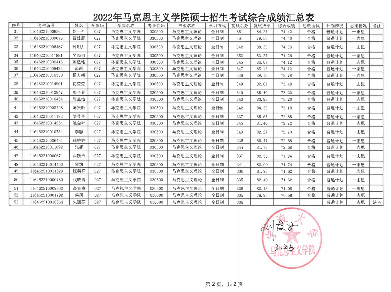 马克思主义学院2022年硕士研究生招生考试综合成绩公示(一)