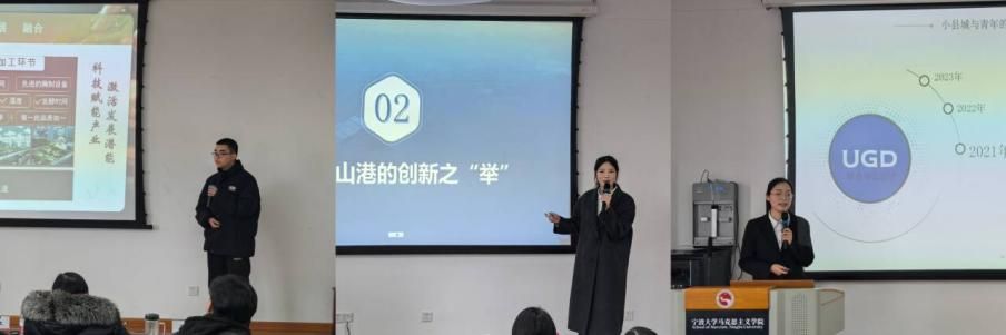 高奕同学从自身博物馆志愿讲解员的经历出发,讲述当前书画影音作品以及宁波地区为优秀传统文化注入的活力,表达了自己身为新时代文化传播者,要让中华优秀传统文化焕发生机的期望。李佳欣同学讲述了初代垦荒人克服恶劣环境建设海岛、二代垦荒人利用风能赋能海岛建设再到新时代垦荒人在各自领域延续垦荒精神的故事,大陈岛的垦荒精神激励着新时代青年人勇做迎难而上的“垦荒人”。邵露艺同学以本人的成长经历为主线,讲述在宁波、赣州、贵州等地,从阳明先生的教诲与事迹中完成从“形”到“醒”再到“行”的过程,展现了宁波及浙江的文化自信与当代青年传承阳明文化的决心。